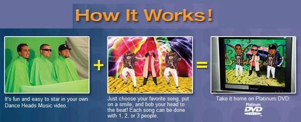 The participants can sing a song or just laugh and bob their heads to some great pop hits such as "I Feel Good", "Super Freak" , "I will Survive" and many more tunes from which they can participate alone, as a duet, or as a trio, but don't confuse Dance Heads with lip-syncing or karaoke!